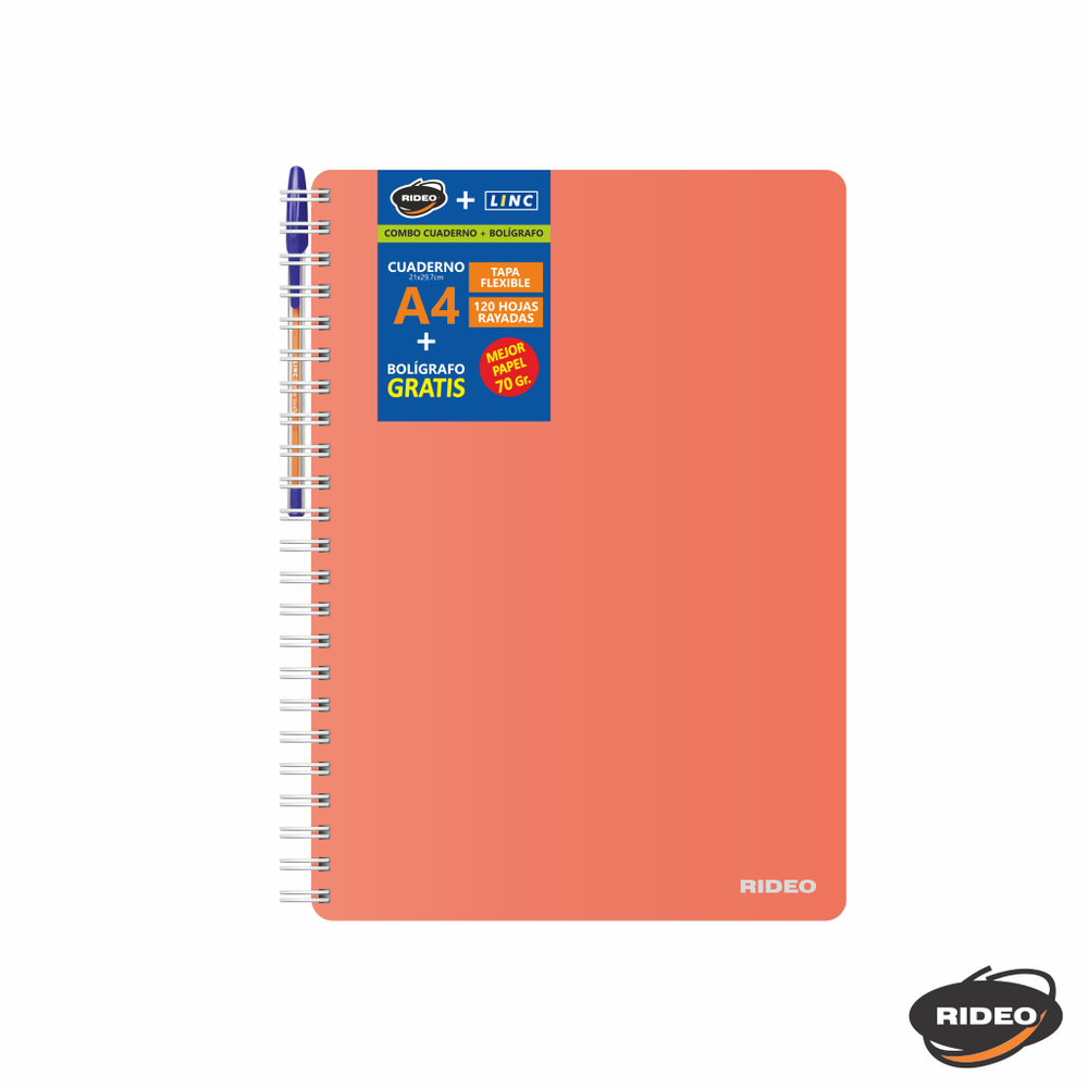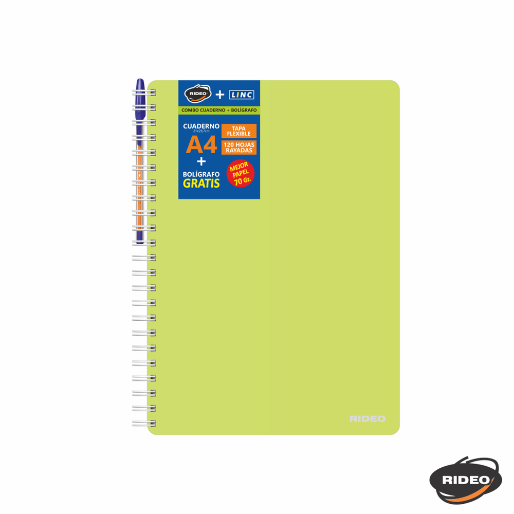 CUADERNO A4 - NEON - TAPA FLEXIBLE - CON ARCHIVO - CON BOLIGRAFO GRATIS